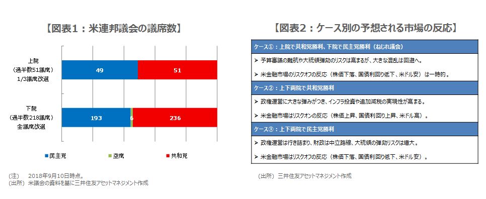 米国では11月6日に中間選挙が行われます。中間選挙では、上院の定数100議席のうち、3分の1に相当する33議席(今回は補欠選挙2議席を含めて35議席)が、下院の定数435議席の全議席が、それぞれ改選されます。現在、共和党の保有議席数は上院が51、下院が236、民主党は上院が49、下院が193であり、共和党が上下両院で過半数を握っています(図表1)。