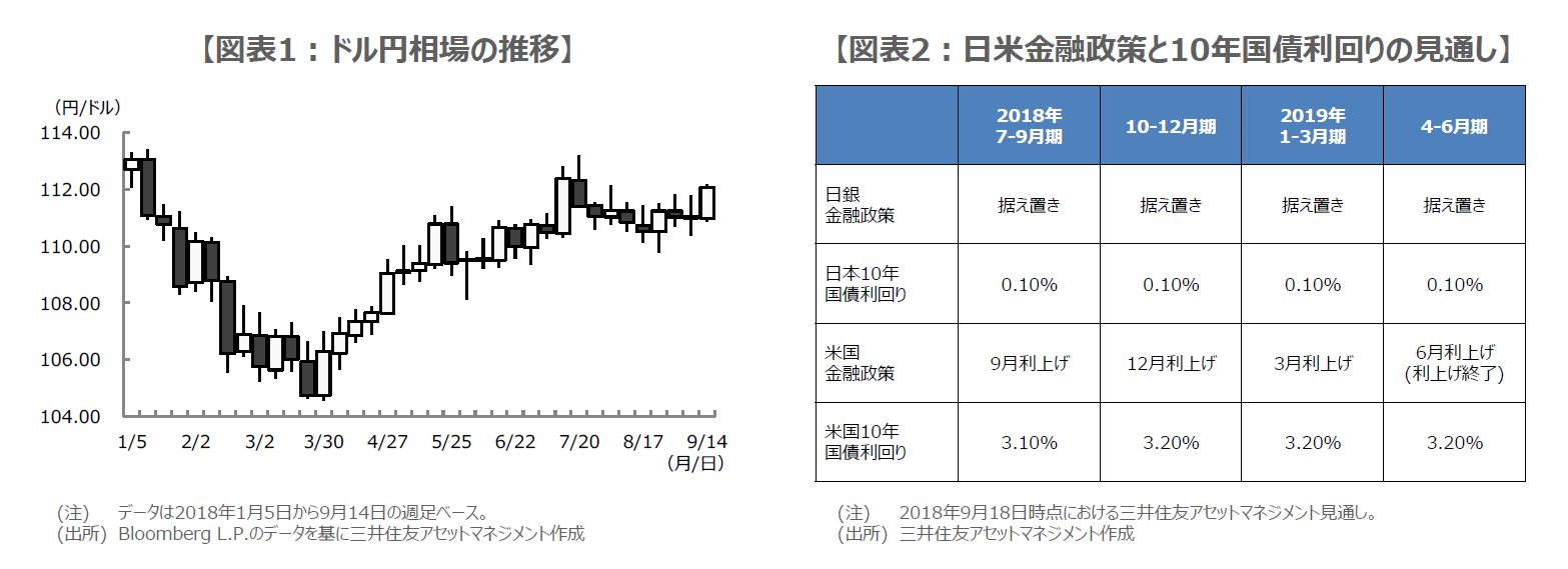 次に、③について、日銀が7月31日に金融緩和の持続性を強化する方針を示したことや、安倍首相が9月20日の自民党総裁選挙で3選を果たしたことから、金融政策は当面現状維持される可能性が高く(図表2)、円相場の材料にはなりにくい状況です。また、堅調な米国経済を背景に、米連邦準備制度理事会(FRB)は3カ月毎の利上げペースを維持するとみられます。ただ、弊社は来年6月で利上げはいったん終了し、ドル高の勢いは強まらないと予想しています。