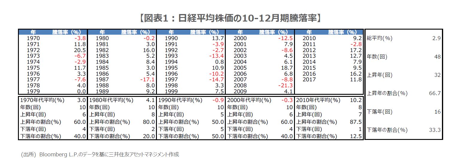 日経平均の10-12月期騰落率は過去48年で平均プラス2.9%、上昇した年の割合は66.7%