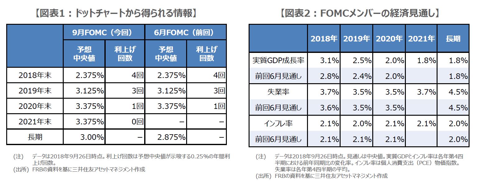 9月25日、26日に開催された米連邦公開市場委員会(FOMC)では、予想通り0.25%の利上げが決定されました。なお、FOMCメンバーが適切と考える政策金利水準の分布図、「ドットチャート」が示唆する0.25%の年間利上げ回数は、2018年が4回、2019年が3回、2020年が1回となり、前回6月時点でドットチャートが示唆した回数から変化はありませんでした(図表1)。