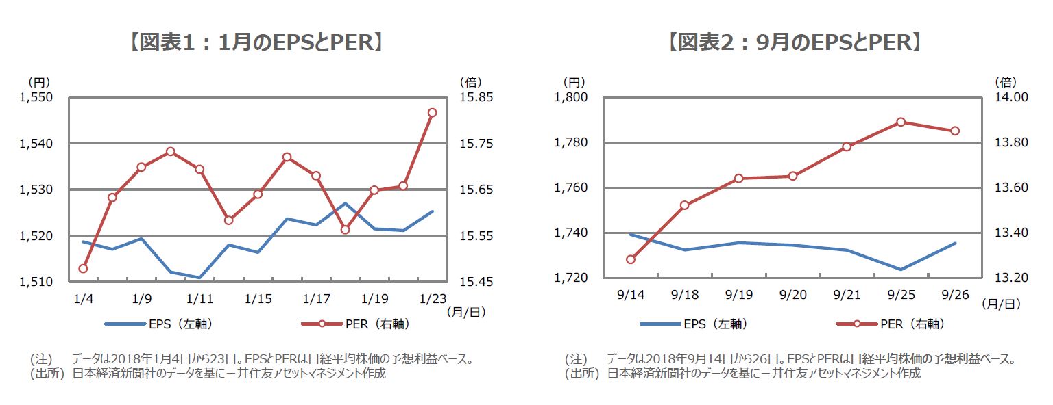 次に、日経平均株価を予想利益ベースの1株あたり利益(EPS)と株価収益率(PER)に分け、1月4日から1月23日までの期間(図表1)と、9月14日から9月26日までの期間(図表2)の推移を確認します。図表1、図表2をみると、いずれもEPSが横ばいであるのに対し、PERが上昇していることが分かります。つまり、1月も9月も、業績を反映したEPS主導の株高ではなく、期待を反映したPER主導の株高であることが分かります。