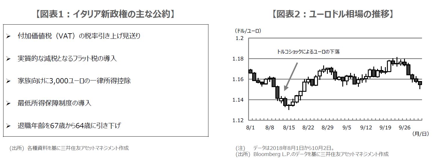 イタリアの新政権は、ポピュリズム(大衆迎合主義)色の濃い、「五つ星運動」と「同盟」による連立政権です。彼らの選挙公約には、付加価値税(VAT)の税率引き上げ見送りや、最低所得保障制度の導入などが含まれています(図表1)。そのため、今回の経済財政計画における財政赤字の拡大は、公約実現に向けた新政権の強い意思表明と捉えることができます。