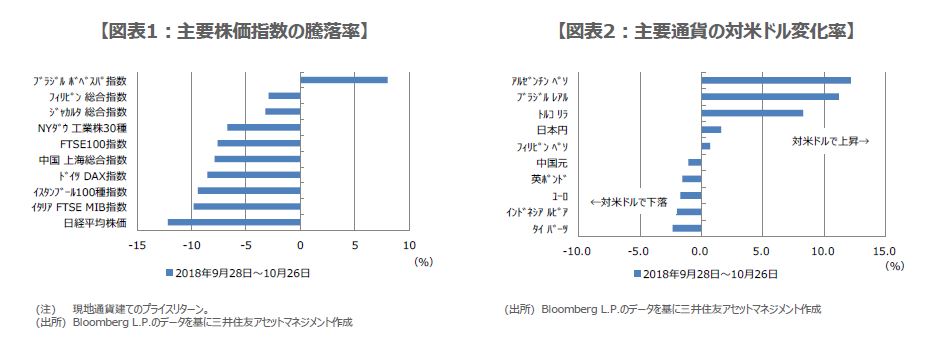 次に為替市場の動きを確認します。主要通貨について、9月28日から10月26日までの対米ドル騰落率をみると、図表2の通りになります。今年の夏に対米ドルで急落したアルゼンチンペソやトルコリラは、上昇に転じています。アジア通貨や、英ポンド、ユーロは対米ドルで下落していますが、下落率は1~2%程度です。少なくとも、円全面高とはなっておらず、世界の為替市場全体が混乱している状況ではありません。