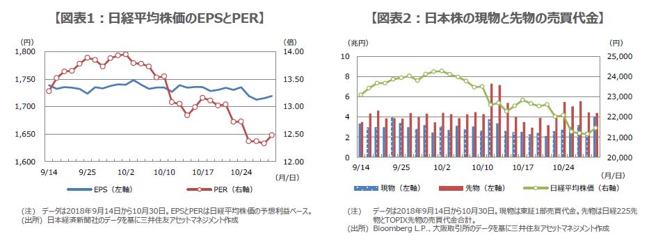 PERは10月の日経平均急落時大きく水準を切り下げたが、EPSは比較的落ち着いた動きだった
