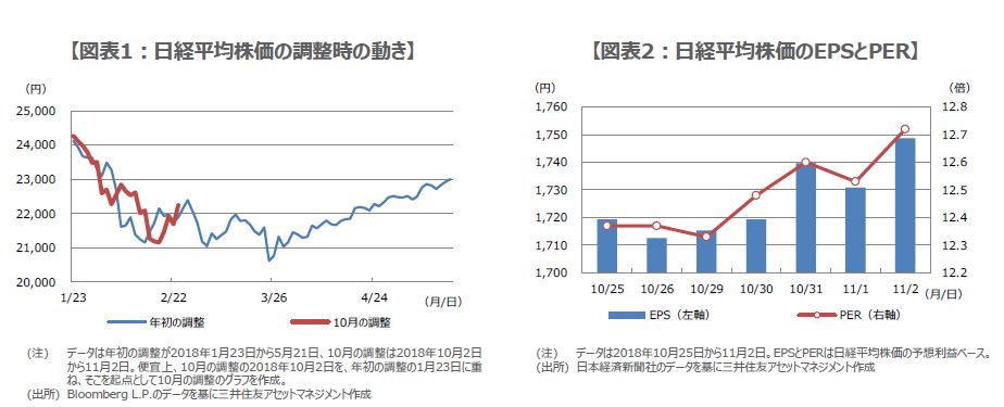 しかしながら、米国家経済会議(NEC)のクドロー委員長はその後、草案作成の要請は受けていないと発言したことで、週明け11月5日の日経平均株価は、寄り付き後、すぐに22,000円台を割り込む展開となりました。なお、10月の日経平均株価の調整は、年初の動きにかなり類似しています(図表1)。この先、年初のような二番底をつける展開が必ずしも見込まれる訳ではありませんが、値動きの不安定さは幾分残る恐れがあります。