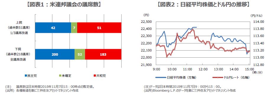 11月7日の東京株式市場で、日経平均株価は22,189円74銭で寄り付きました。開票が進むなか、日経平均株価は、下院で共和党が優勢になると、追加減税などの政策期待から上昇し、民主党が追い上げをみせると、期待後退で下落するなど、慌ただしい動きとなりました(図表1)。しかしながら、下院での民主党勝利が確実視されるにつれて、売り圧力が強まり、結局、22,085円80銭で取引を終えています。
