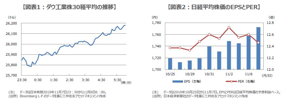 ダウ工業株30種平均は11月7日、前日比545ドル29セント高の26,180ドル30セントで取引を終え、10月9日以来となる節目の26,000ドルを回復しました(図表1)。米下院議長への就任が見込まれる民主党のナンシー・ペロシ院内総務が同日、トランプ米大統領と共にインフラ投資に取り組みたいとの考えを示し、追加的な景気刺激策への期待が膨らんだことが株高の一因とみられます。