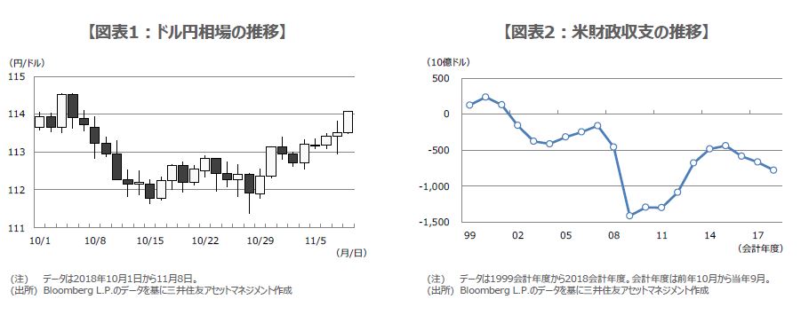 11月8日の外国為替市場では、米ドルが対主要通貨でほぼ全面高の展開となりました。11月6日に投開票が行われた米中間選挙や、11月7日、8日に開催された米連邦公開市場委員会(FOMC)では大きな波乱もみられず、米ドルに買い安心感が広がったことが主な要因と推測されます。11月8日のニューヨーク外国為替市場では、ドル高・円安が進行し、ドル円は114円台を回復しています(図表1)。