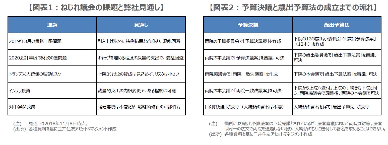 米国では2019年1月から第116議会が始まりますが、中間選挙の結果、上院と下院で多数党が異なる「ねじれ議会」となります。そこで、今回のレポートでは、市場が注目するねじれ議会の課題を整理します(図表1)。まず、米国経済への直接的な影響については、新たな議会で法案が成立しても、実際に発効するのは2019年後半以降とみられるため、当面は限定的と思われます。