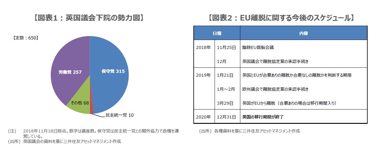 こうしたなか、EUのトゥスク大統領は11月15日、臨時EU首脳会議を11月25日に開催し、協定案に関し、政治レベルで正式合意する方針を示しました(図表2)。一方、メイ首相は不信任投票を乗り切ったとしても、EUとの協議を踏まえ、12月に協定案を議会承認する必要があります。仮に、議会で協定案が否決され、離脱交渉が振り出しに戻るとの懸念が強まれば、金融市場が混乱する恐れもあります。