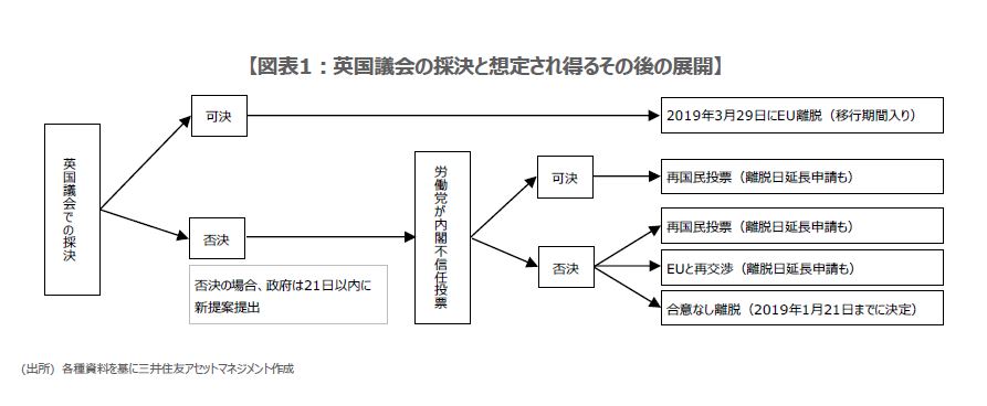 弊社では、離脱協定案と政治宣言案は最終的に採決され、英国とEUは合意ありの離脱に向かうとみています。しかしながら、図表1の通り、内閣不信任投票の流れとなった場合は注意が必要です。可決されれば総選挙となり、否決されても再国民投票やEUとの再交渉、合意なしの離脱という展開が想定されます。いずれにせよ、英国の政局不安が強まるため、欧州中心に金融市場が大きくリスクオフに傾く恐れがあります。