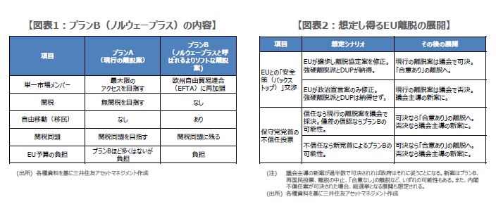 それぞれの主張は次の通りです。①のメイ首相は、離脱条件などを定める離脱協定案と、将来関係の大枠を示す政治宣言案を議会で採決したい立場です。しかしながら、北アイルランドとEU加盟のアイルランドとの国境問題について、強硬離脱派とDUPから強い反発を受けており、改めてEUと打開策を検討する方向で動いています。なお、メイ首相は、再国民投票、プランB(図表1)、合意なし離脱は受け入れないとしています。