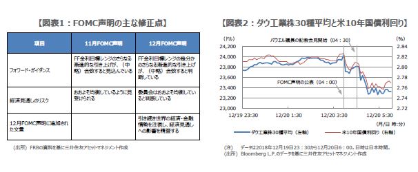①について、弊社では「フェデラルファンド(FF)金利の目標レンジのさらなる漸進的な引き上げ(further gradual increases)」の文言が、より経済指標を重視する政策スタンスを示唆する内容に修正され、「経済見通しのリスクはおおよそ均衡している(roughly balanced)」との文言も、幾分下方修正される可能性があるとみていました。しかしながら、修正された内容をみる限り、今回の声明は期待されたほどハト派的ではありませんでした(図表1)。