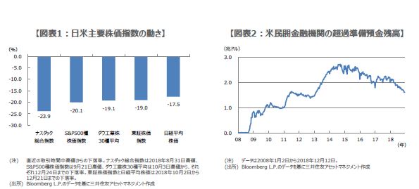 12月24日の米国株式市場で、ダウ工業株30種平均は前週末比653ドル17セント(2.9%)安の21,792ドル20セントで取引を終えました。また、S&P500種株価指数も同65.52ポイント(2.7%)安で引け、9月高値からの下落率が20%に達したことで、「弱気相場」入りとなりました(図表1)。背景には、米政府機関閉鎖の長期化や金融市場の安定性に対する投資家の懸念があると思われます。