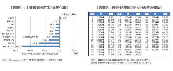 2018年のドル円相場を振り返ると、12月25日時点において、年初来安値(ドルの安値、円の高値)は3月26日につけた1ドル=104円56銭水準で、年初来高値(ドルの高値、円の安値)は10月4日につけた1ドル=114円55銭水準です。値幅は9円99銭と、わずかに10円を割り込んでおり、貿易問題を巡る米中の対立などでリスクオフ(回避)の動きが目立った今年の金融市場においては、意外に小さい印象です。