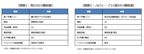 修正案に対しては、労働党議員のうち40名~80名が最終的に賛成するとの一部報道もみられますが、これも不確実性が高い状況です。そのため、今後の展開として、①EUとの再交渉による「ノルウェー・プラス型」(図表2)など新案の策定、②再国民投票の実施、③総選挙の実施、④離脱の取り止め、⑤「合意なし」の離脱が考えられますが、これらはいずれも起こり得ることになります。また、①~③の場合は、3月末の離脱期限が延長される公算が大きくなります。