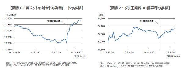 離脱案の否決は織り込み済みであったため、市場の反応は冷静でした。否決の結果を受けて、英ポンドは対米ドルで上昇し(図表1)、ダウ工業株30種平均も上昇するなど(図表2)、典型的な「Sell the rumor, buy the fact(噂で売って事実で買う)」の動きとなりました。メイ首相が辞任しなかったことも不透明感の後退につながり、いったん相場の「あく抜け」感が強まったものと思われます。