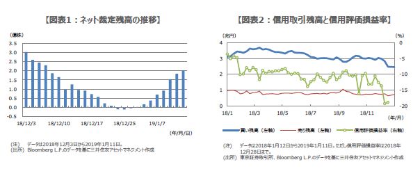 図表2をみると、信用取引で買った株式の含み損益の度合いを示す信用評価損益率は昨年12月に大幅なマイナスとなり、信用取引の買い残高(東京・名古屋2市場、制度信用と一般信用の合計)も大きく減少していることが分かります。これは、年末の株安で信用買いを入れていた投資家の含み損が拡大し、信用買いの解消が進んだことを示唆しています。そのため、信用買いから生じる潜在的な戻り売り圧力は、相当程度低下した可能性があると思われます。