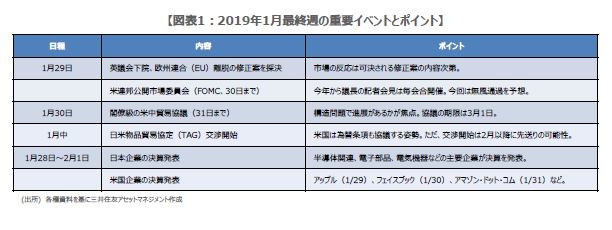 今回は1月最終週の重要イベントを整理し(図表1)、予想される市場の反応について考えます。まず、英議会下院では1月29日に欧州連合(EU)からの離脱について修正案の採決が行われます。現時点で、メイ首相の修正案よりも与野党の超党派による修正案が可決される見通しが強まっています。超党派の修正案には3月末の離脱期限の延期を求める内容が含まれており、可決なら市場はいったんポジティブな反応を示すと思われます。