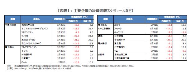 日本では今週から3月期決算企業の2018年4-12月期決算発表が本格化します。今回の決算では、中国経済の減速とアップル・ショックの影響を見極めることがポイントになると思われます。一般に中国関連とされる銘柄のうち、産業用ロボット大手のファナックが1月31日に決算を発表し、建機では日立建機が1月30日に、小松製作所が1月31日に、それぞれ決算を発表します(図表1)。