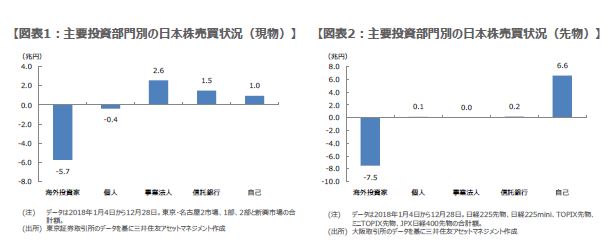 ただ、日経平均株価は足元で国内外の重要イベントを無難に消化し、下値を固めつつあるように思われます。この先、日本株が明確に上昇基調を回復するためには、昨年日本株の現物を約5.7兆円、先物を約7.5兆円売り越した海外投資家が、日本株を買い戻すためのストーリーを描ける状況が必要です(図表1、図表2)。具体的には、英国のEU離脱問題および米中貿易摩擦問題の進展や、米中経済指標の持ち直しなどにより、世界景気に対する悲観的な見方が修正される状況です。