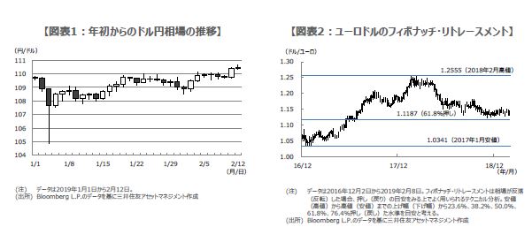 ドル高・円安方向の次の目途は、200日移動平均線が位置する111円30銭近辺と思われます。しかしながら、1月の米連邦公開市場委員会(FOMC)がハト派的な内容だったため、米長期金利の上昇余地は乏しく、一本調子のドル高は想定しにくいとみています。そのため、一段のドル高には、米国景気の底堅さを裏付ける経済指標や、米中貿易協議が実際に進展して株式市場が安定することなどが必要と考えます。