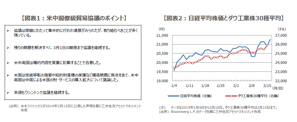 2月14日、15日に北京で開催された閣僚級の米中貿易協議が終了しました。米ホワイトハウスは2月15日の声明で、「協議は詳細にわたって集中的に行われ進展がみられた」とした一方、「取り組むべきことが多く残っている」と述べ、3月1日の期限まで協議を継続する方針を示しました(図表1)。また声明では、米中両国が確約内容を覚書に記載することで合意したことを明らかにしました。