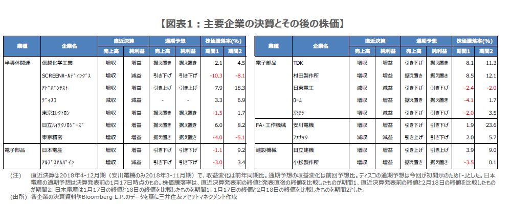 3月期決算企業の2018年4-12月期決算では、中国景気の減速やスマートフォン(スマホ)需要の減退などの影響が、想定の範囲内だったとはいえ、顕著にみられました。そのため、今回の企業決算は、日経平均株価など指数全体を押し上げるほどの材料にはなりませんでした。しかしながら、図表1の通り、個別企業においては、悪材料出尽くしで株価が上昇に転じる「あく抜け」の動きが確認されます。