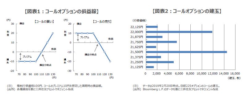 例えば、「3月満期の日経225オプションで行使価格21,500円のコールオプション」とは、「3月8日に21,500円で日経平均株価を買う権利」のことです。権利を買う場合、買い手は売り手に対してプレミアムと呼ばれるオプション料を支払います。逆に、権利を売る場合、売り手は買い手からプレミアムを受け取ります。コールオプションの損益線は図表1の通りです。
