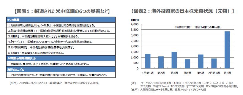 海外投資家は、日本株の先物を年初から累計で約1兆円買い越しています(図表2)。ただ、昨年1年間では約7.5兆円売り越していますので、これは米中貿易協議の進展をある程度見越した先物の買い戻し、つまり、売り(ショート)ポジションの調整に過ぎないと考えられます。それでも、先物が買われて一時的に割高になれば、証券会社などの裁定業者が「先物売り・現物買い」の裁定取引を行うため、現物の日経平均株価は上昇します。