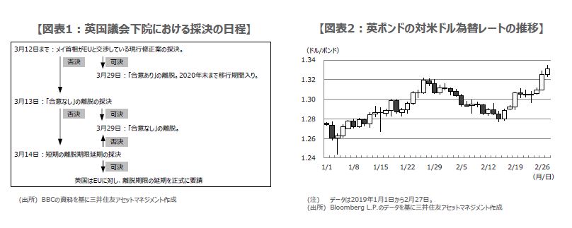 弊社は今後の展開について、議会下院の採決は③まで進み、離脱期限が3カ月程度延期されると予想しています。市場もある程度、このシナリオを織り込みつつあるとみられ、足元では英ポンドの対米ドルでの上昇傾向が顕著です(図表2)。なお、離脱期限が延期された後、英国はアイルランドとの国境問題に関するバックストップでEUと妥協し、最終的に「合意あり」の離脱で着地し、移行期間に入ると考えています。