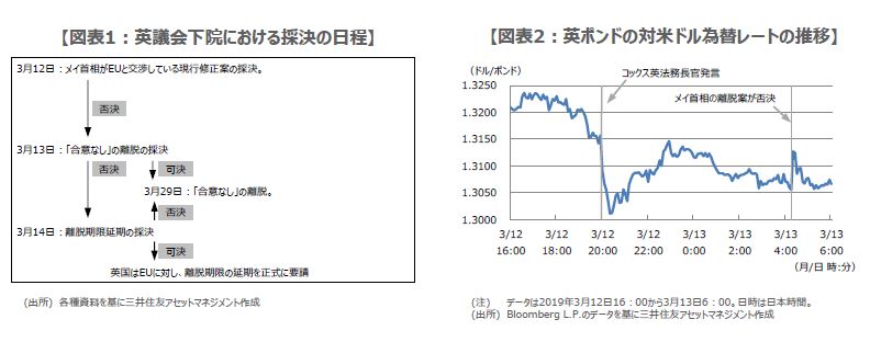 強硬離脱派などは、バックストップに期限を設けることや、英国が一方的にバックストップから抜け出せるようにすることを主張していましたが、コックス英法務長官の見解を踏まえ、今回もメイ首相の離脱案は支持しないという判断に至ったと推測されます。英議会下院は今後、3月13日に「合意なし」の離脱の採決を行い、否決の場合は3月14日に離脱期限延期の採決を行うことになります(図表1)。