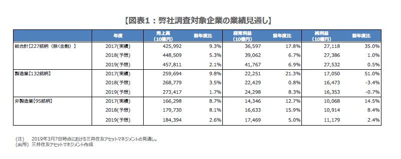 製造業(132社)と非製造業(95社)に分けてみると、製造業の売上高、経常利益、純利益の前年度比伸び率は、2018年度が順に+3.5%、+0.8%、-3.4%、2019年度は+1.7%、+8.3%、-0.7%の着地を見込んでおり、純利益は減益となる見通しです。一方、非製造業は同様に、2018年度が+8.1%、+15.9%、+8.4%、2019年度は+2.6%、+5.0%、+2.4%となり、増収増益は維持されるという予想です。