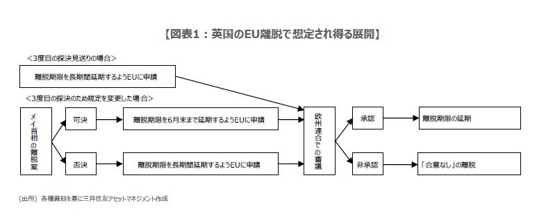 したがって、今回のバーコウ議長の見解は、大勢には影響ないと解釈できます。なお、メイ首相は離脱期限の延期をEUに申請するにあたり、EUから出来るだけ早期に離脱したいとする保守党議員に対し、一定の配慮を示すと考えられます。具体的には、長期延期となっても、英議会下院で離脱案が成立し、EUと合意できた時点で、EUから離脱できるという条項を盛り込むことです。