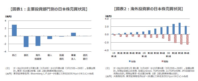 なお、日銀によるETFの買い入れは、年初から3月末まで累計約1兆538億円に達していますが、これも自己に計上されるとみられています。つまり、自己の買い越しは、裁定取引と日銀のETF購入で、ほぼ説明が可能ということになります。日本株は年初から上昇していますが、上昇基調がより強固なものになるためには、やはり海外のリアルマネーが現物市場に回帰することが必要と考えます。