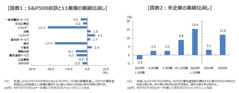 ここからの米国株を展望するにあたり、まず、米国企業の業績見通しを確認しておきます。S&P500種株価指数を構成する企業500社の1株あたり利益について、2019年1-3月期は市場で前年同期比2.5%の減益が見込まれています(図表1)。詳細をみると、11業種のうち、エネルギーと素材が大幅な減益見通しとなっており(それぞれ同21.2%減益、17.4%減益)、これが全体に影響していると思われます。
