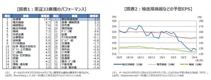 図表1において、新年度入り後の上昇率が大きい上位の業種には外需関連が目立ちます。外需関連業種は、世界景気の先行き懸念が強まった2018年10-12月期、大きく売られた経緯があり、特に「海運業」、「電気機器」、「機械」などは、20%以上下落しました。この時、外需関連業種への投資比率を引き下げ、内需関連業種を引き上げた運用担当者も多かったとみられます。