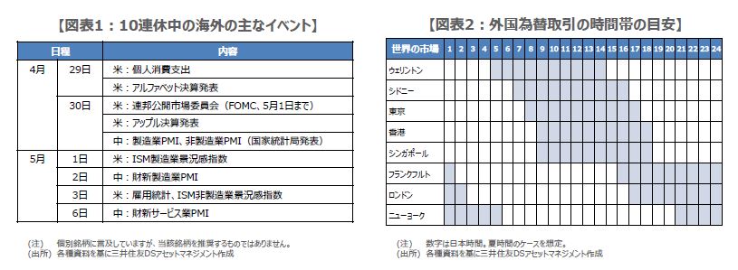 従って、連休直前の日本株市場は、よほど突発的な材料が浮上しない限り、動意の乏しい展開が予想されます。ただ、連休中は海外で重要イベントが控えており(図表1)、主要国の株価動向には注意が必要です。なお、米シカゴ・マーカンタイル取引所(CME)に上場されている日経225先物は、連休中でも取引されているため、連休後の日経平均株価の水準をみる上で参考になります。
