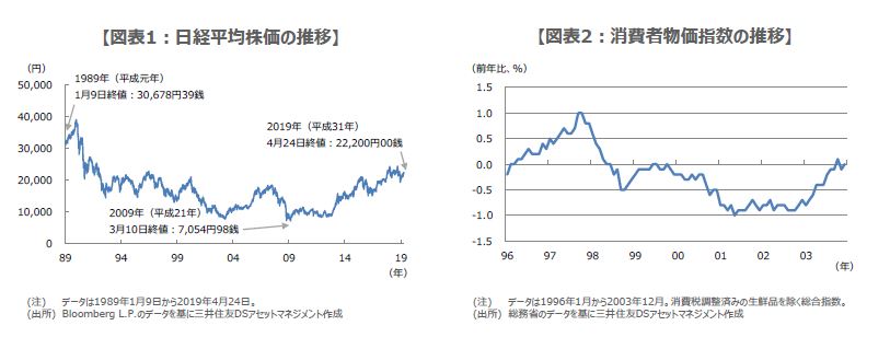 日経平均株価はその後、低迷が続き、2009年(平成21年)3月10日に終値ベースで7,054円98銭の安値をつけました。2019年(平成31年)4月24日の終値が22,200円ちょうどでしたので、日経平均株価は平成元年から平成21年までに約77.0%下落し、その後は平成31年まで約214.7%上昇したことになります(図表1)。平成を通じての騰落率は依然マイナスですが、これには次のような理由が考えられます。