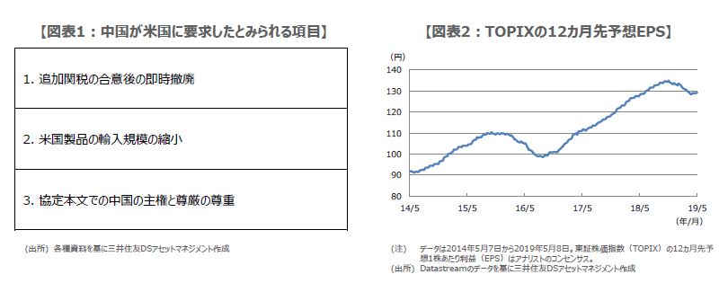 トランプ米政権は5月10日、対中制裁関税第3弾(2,000億ドル分の中国製品に対する制裁関税)の税率を10%から25%へ引き上げました。今回の米中貿易協議では、両国に歩み寄りの姿勢はみられませんでした。報道によれば、米国は中国に産業補助金を削減させたい一方、中国はこれを国策として譲らない姿勢を示した模様です。また、米国は合意後の制裁関税について一部を維持したい一方、中国は即時撤廃を要求したとみられます(図表1)。