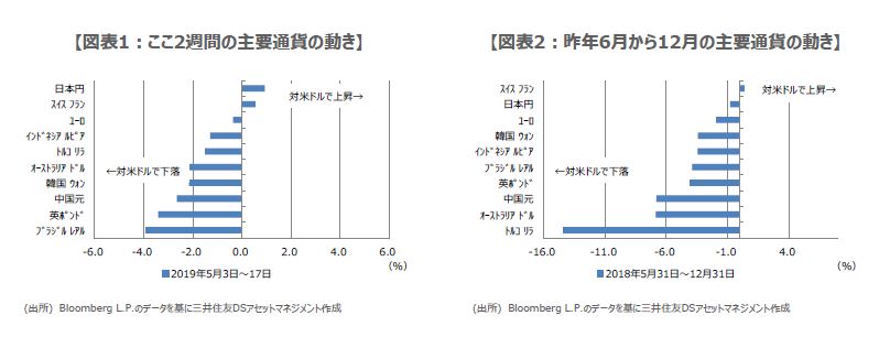米中貿易摩擦問題は、対立激化なら世界経済の成長ペースを鈍化させる要因となりますが、協議で合意に至る可能性もあるため、先行きが非常に読みにくい材料です。このような場合、為替市場では米ドルや日本円など、流動性の高い通貨が一時避難的に選好される傾向があります。実際、ここ2週間の動き(図表1)や、米中関税引き上げ合戦が激化した昨年6月から12月の動き(図表2)をみると、米ドルや日本円が選好されています。