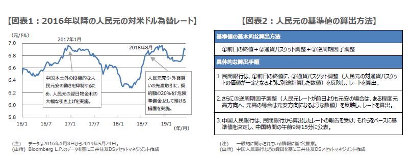 なお、中国当局は2016年以降、1ドル=7元に近づく局面で、元安の進行を抑制する姿勢を示しています(図表1)。その結果、これまでのところ、人民元が1ドル=7元を超えて元安方向に進むことはなく、市場でも、この水準が人民元の防衛ラインとの見方が一般的です。なお、足元では、5月23日の取引時間中に、1ドル=6.9219元水準まで、元安・ドル高が進行しました。