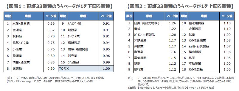 直近3年のデータによると、東証33業種のうちベータ値が1を下回るのは15業種で内需が目立つ