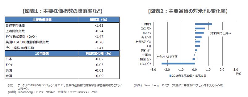 トランプ米政権は5月17日に、カナダとメキシコに課す鉄鋼とアルミニウムの追加関税撤廃を発表し、市場参加者の間には、米国・メキシコ・カナダ協定(USMCA)の批准が前進するとの期待が広がっていました。そのため、今回は想定外の追加関税発表となり、先週末の主要市場では、株価の下落、国債価格の上昇(利回りは低下)、円やスイスフランの上昇など、典型的なリスクオフ(回避)の動きがみられました(図表1、図表2)。