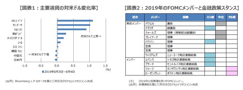 また、セントルイス地区連銀のブラード総裁は6月3日、予想よりも急激な景気減速に備え、政策金利の下方向の調整を加えることは、近く正当化されるだろうとの考え方を示しました。なお、2019年のFOMCで、政策決定の投票権を持つメンバーは図表2の通りです。パウエル議長とクラリダ副議長は常任メンバーとして投票権を持ち、ブラード総裁も2019年に投票権を持ちます。