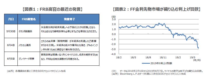 6月4日のパウエル米連邦準備制度理事会(FRB)議長の発言を機に、市場の米早期利下げ期待が一段と高まっています。また、クラリダ副議長やブレイナード理事という、米連邦公開市場委員会(FOMC)のほかの中核メンバーからも、パウエル議長と同様、景気拡大を維持するため、経済の見通しに下方リスクが生じれば、適切に行動するという旨の発言がみられています(図表1)。
