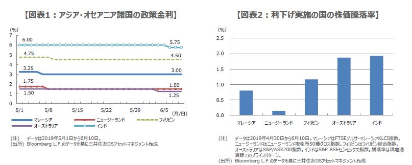 一方、世界に目を向けると、英調査会社IHSマークイットが6月3日に発表した5月のグローバル製造業PMI(購買担当者景気指数)は49.8と、前月比0.6ポイント低下し、景気判断の節目とされる50を下回りました。5月以降、アジア・オセアニアの中央銀行は、相次いで利下げに踏み切っており(図表1)、これらの国々の株価は、総じて底堅く推移しています(図表2)。