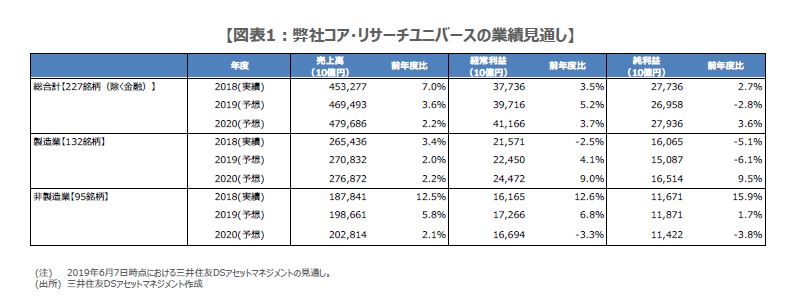弊社は6月7日、調査対象とするコア・リサーチユニバース227社の業績見通しを更新しました。2018年度の実績は、売上高が453.3兆円、経常利益が37.7兆円、純利益が27.7兆円でした(図表1)。前年度比の伸び率は、順に+7.0%、+3.5%、+2.7%で、増収増益となりました。前回3月7日時点の見通しでは、+5.3%、+6.7%、+1.0%でしたので、売上高と純利益は予想比上振れの着地です。