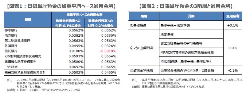 しかしながら、金融機関への影響を抑制しつつ、長短金利の操作水準を引き下げることは、技術的に可能です。業態別の日銀当座預金残高をみると、各業態とも政策金利残高が少なく、実は加重平均ベースの適用金利は現状プラスとなっています。そこで、各適用金利残高を不変と仮定し、政策金利残高の適用金利を-0.2%に引き下げて試算すると、加重平均ベースの適用金利は、信託銀行のみ若干のマイナスという結果になります(図表1)。