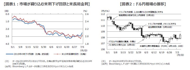 そのため、105円水準までドル安・円高が進むリスクは、いったん後退したと考えています。一方、ドル高・円安方向の動きについては、7月5日の米雇用統計発表後、ドル円は108円台後半をつけたものの、FF金利先物市場では、なお年内2回の利下げが織り込まれている状況です。したがって、米長期金利の上昇余地は乏しく、110円水準まで一気にドル高・円安が進む展開は、今のところ見込み難いと思われます。